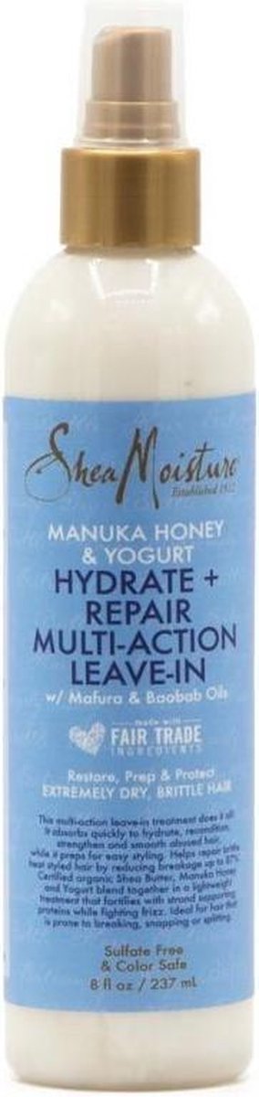 - Bij bol.com. kan je Shea Moisture Manuka Honey & Yogurt - Hydrate Repair Multi Action Leave in Spray - 237 ml. bestellen voor slechts €15,00